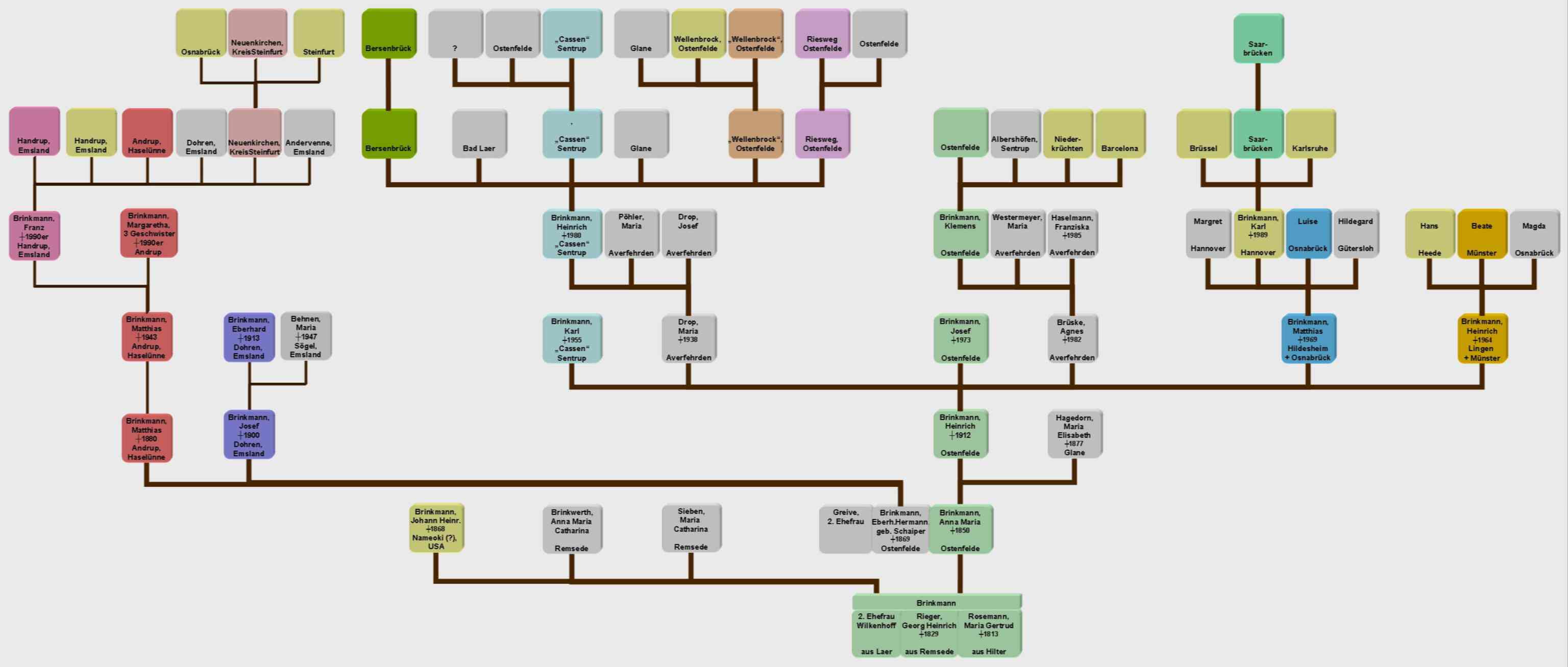 Die Brinkmann-Familien sind farblich dargestellt. Nachkommen mit anderen Familiennamen (grau) sind nur dann angegeben, wenn ein Geschwister weiterhin den Namen Brinkmann trägt. Brinkmann-Familien mit gleichen Wohnsitz bilden mit gleicher Farbe eine Linie. Nachkommen im Kindesalter sind nicht aufgeführt. |